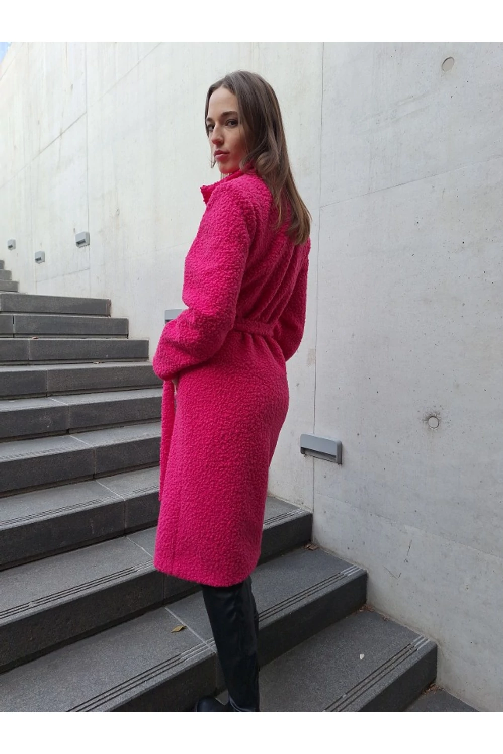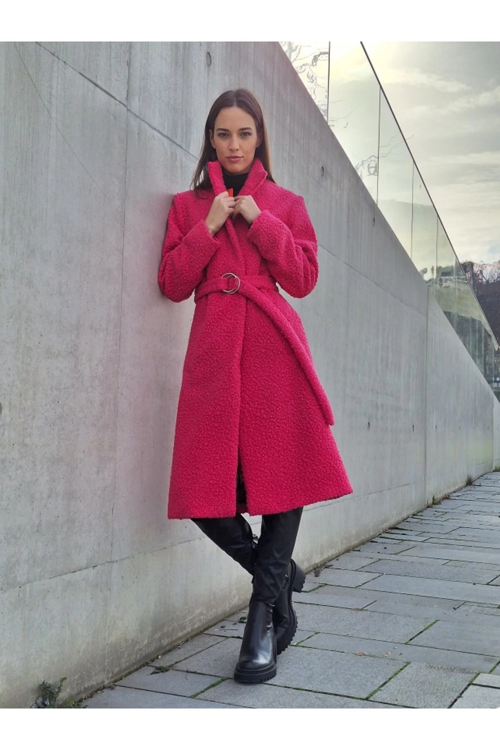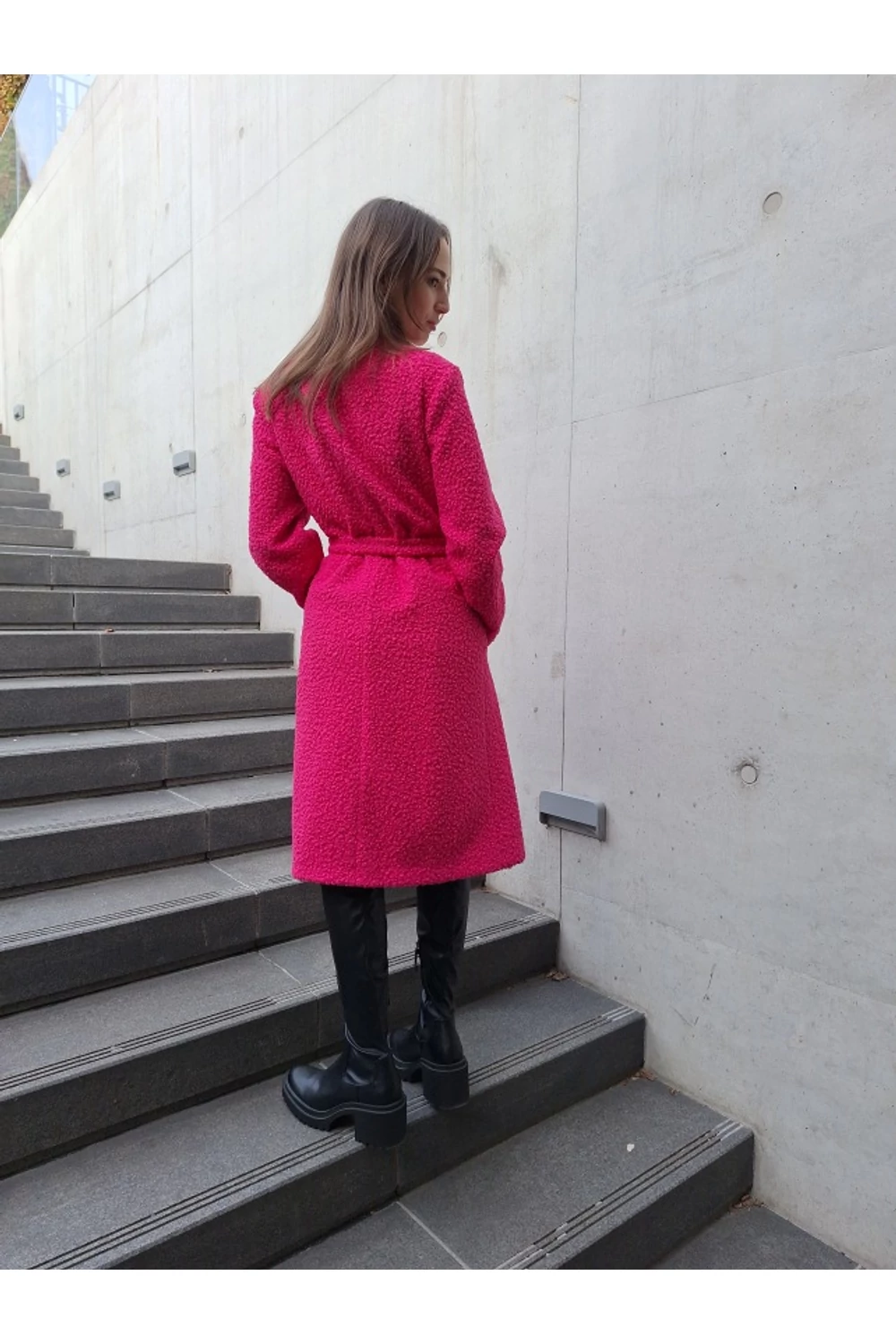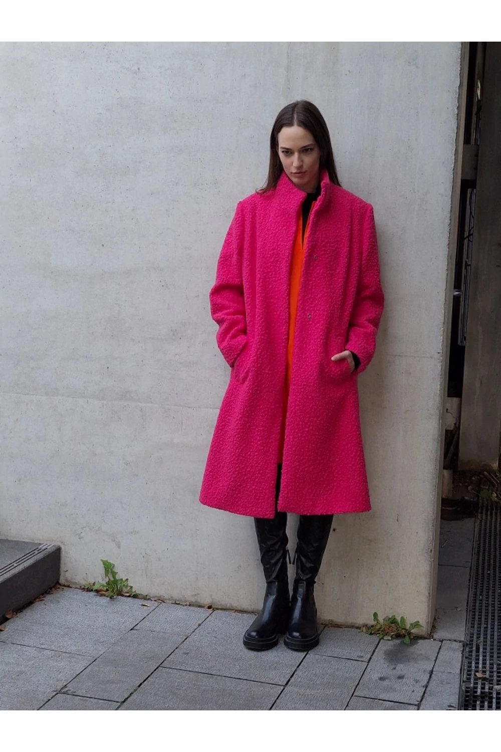 Finoman, enyhén karcsúsított, térd alá érő modell. A derekán saját anyagából készített övvel rögzíthető. Zsebes, bélelt buklé kabát.