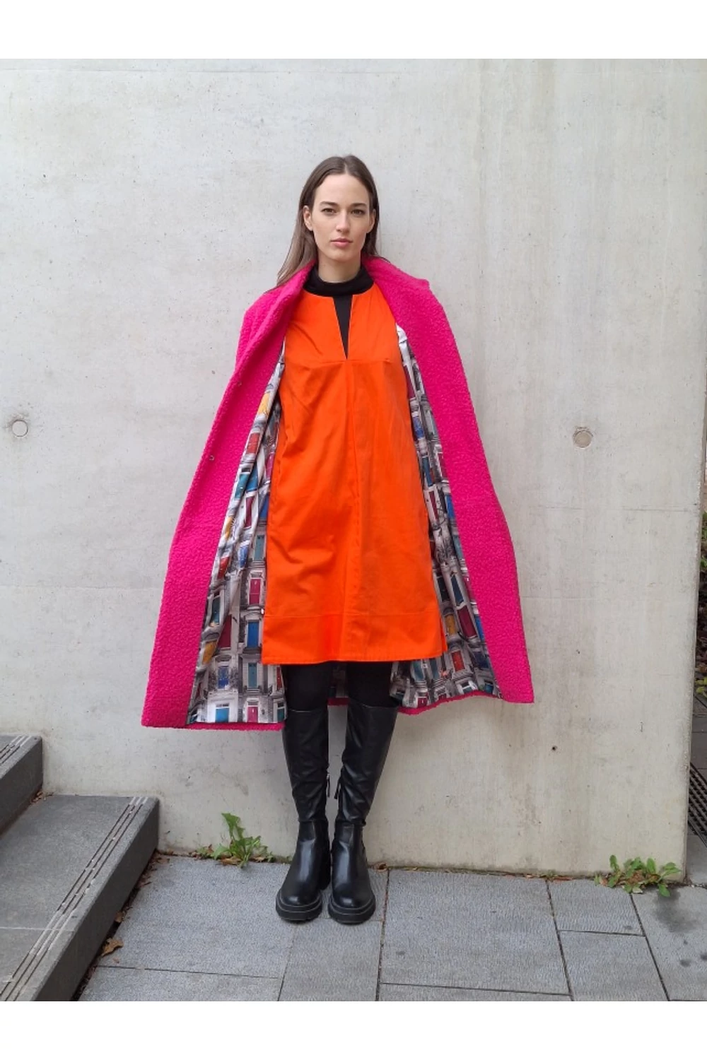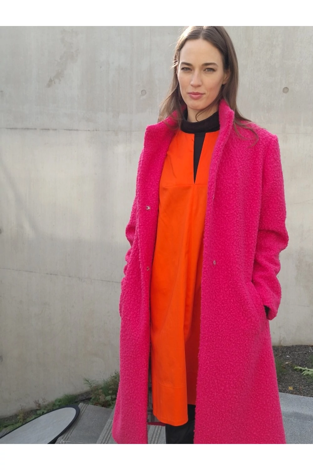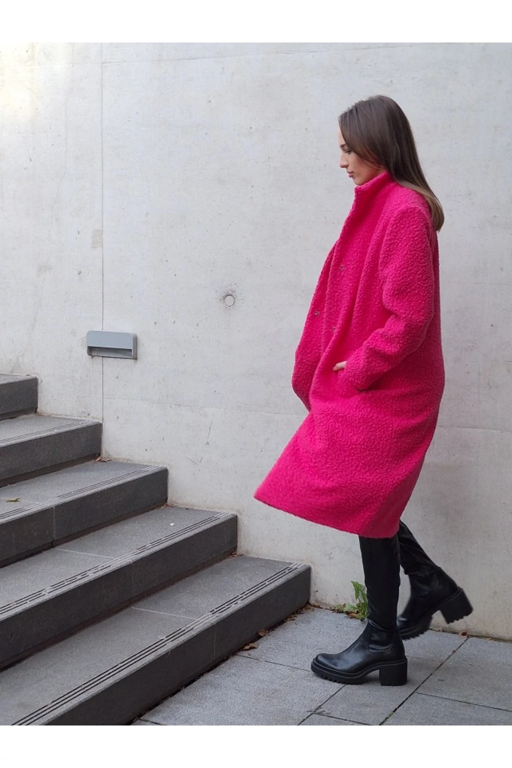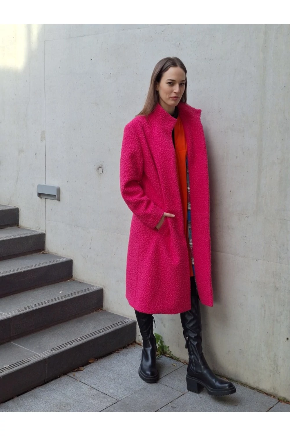 Finoman, enyhén karcsúsított, térd alá érő modell. A derekán saját anyagából készített övvel rögzíthető. Zsebes, bélelt buklé kabát.