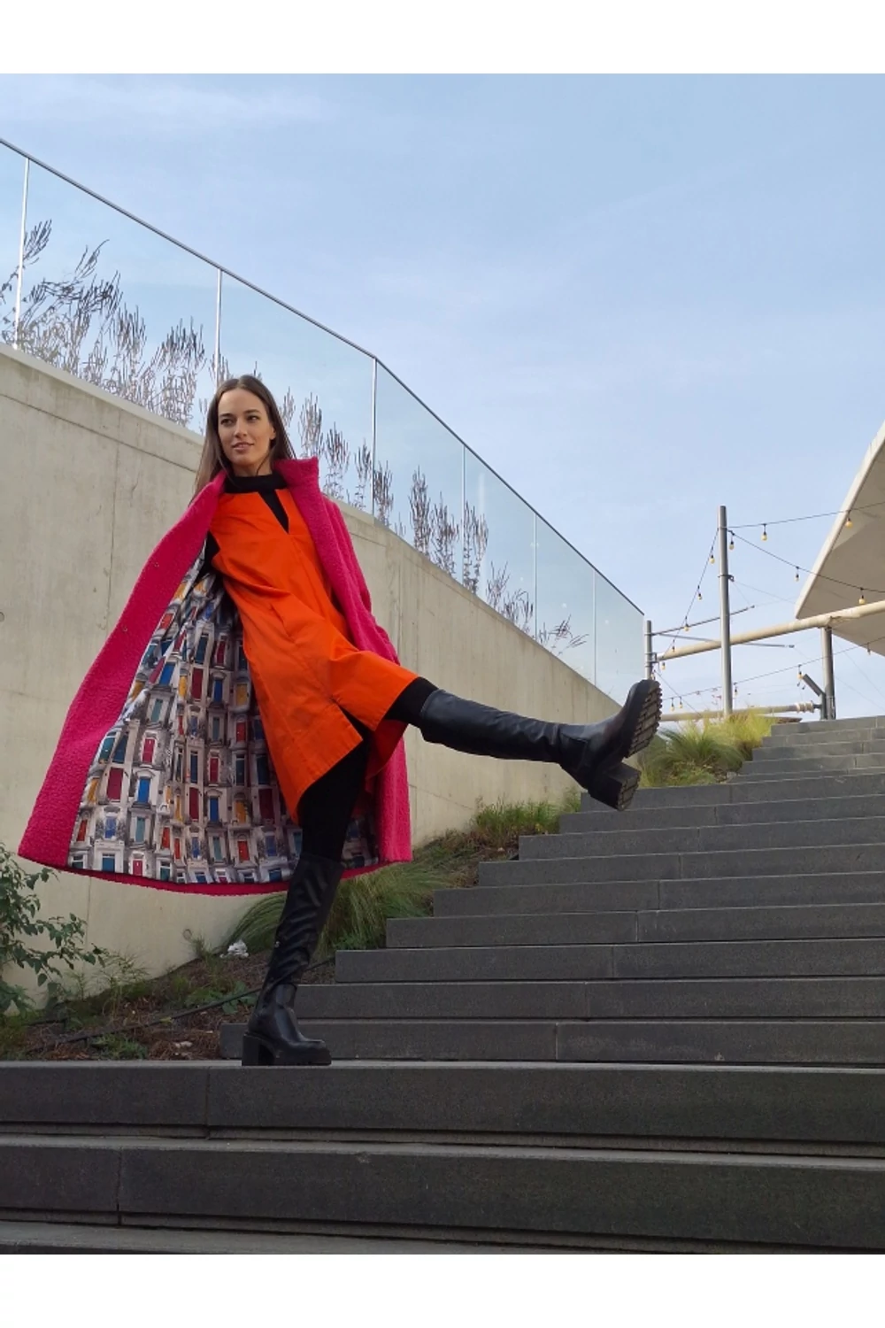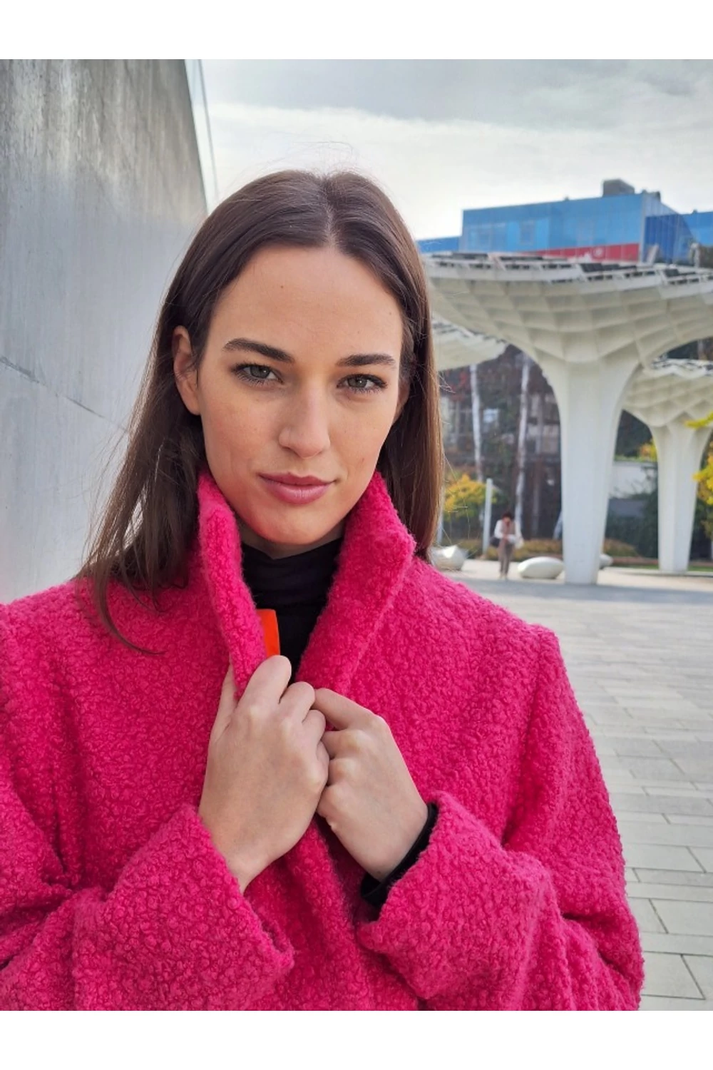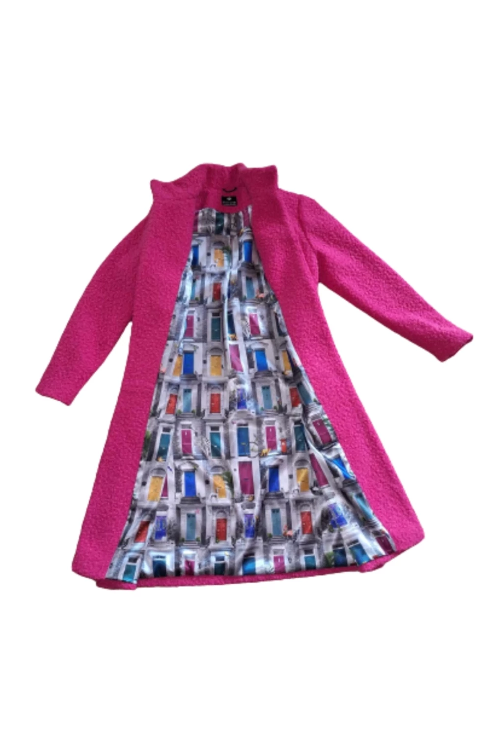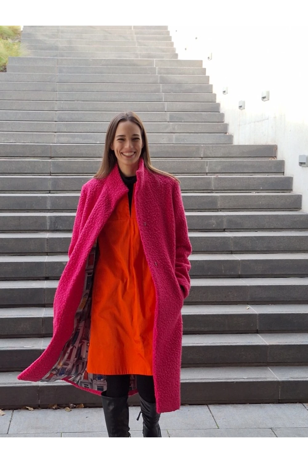 Finoman, enyhén karcsúsított, térd alá érő modell. A derekán saját anyagából készített övvel rögzíthető. Zsebes, bélelt buklé kabát.